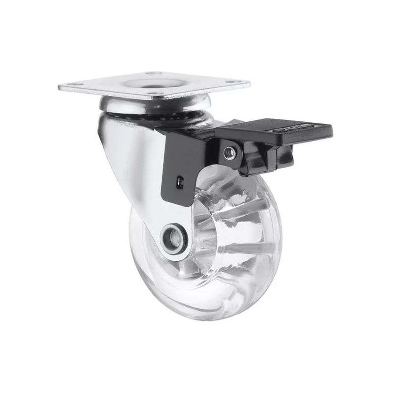 A roda transparente em PU gel proporciona deslocamento extremamente silencioso, excelente absorção de impactos e proteção ao piso, sem marcar superfícies delicadas. O sistema giratório garante fácil manobra mesmo em espaços reduzidos, enquanto o freio integrado permite travar a roda com firmeza, oferecendo maior estabilidade ao móvel.