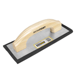 Desempenadeira com lâmina de aço e cabo de madeira fixado por eletrofusão. Borracha de EVA fixada a lâmina com bordas nas duas laterais. Formato: retangular.