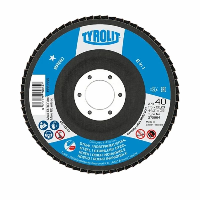 O Disco Flap 28CLA 4 1/2" x 7/8" (22,23mm) A120 Basic – Tyrolit é um abrasivo versátil, indicado para operações de desbaste leve e acabamento em superfícies metálicas.