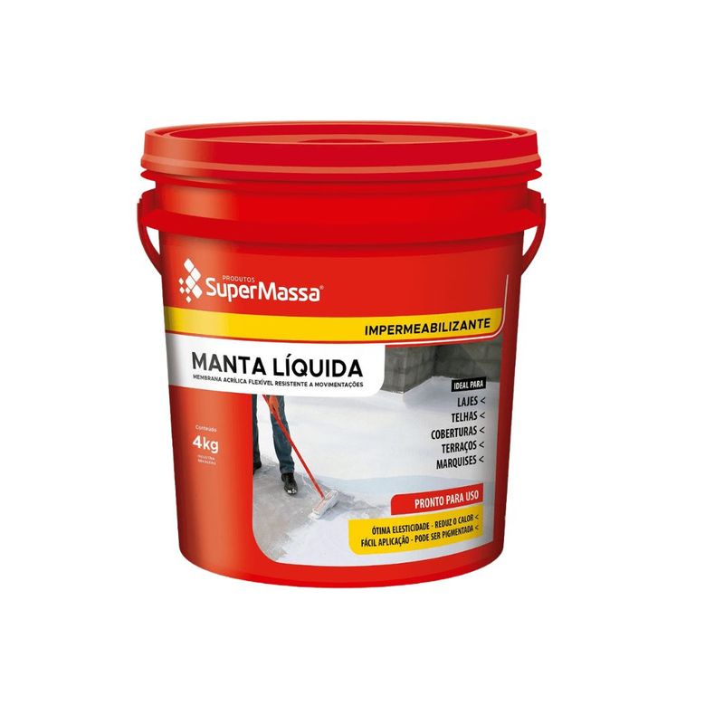 A Manta Líquida 04kg Branca da Supermassa é a solução ideal para impermeabilização de superfícies expostas, protegendo contra infiltrações e variações climáticas. Sua fórmula elástica acompanha a movimentação da estrutura, evitando trincas e rachaduras. Além disso, sua coloração branca reflete o calor, reduzindo a temperatura dos ambientes internos. Com fácil aplicação e secagem rápida, é indicada para lajes, telhados, calhas e outras áreas sujeitas à umidade. Proporcione mais durabilidade e conforto à sua construção com a Manta Líquida Supermassa