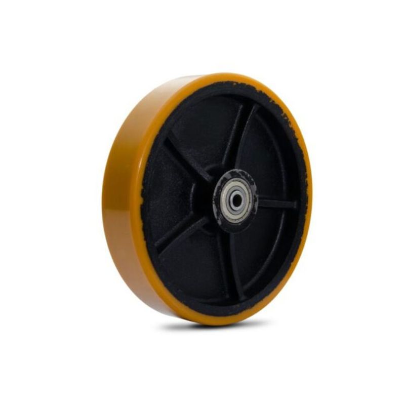 Fabricada com núcleo em ferro e revestimento em poliuretano (PU), essa roda oferece excelente capacidade de carga, resistência ao desgaste e menor nível de ruído em comparação às rodas totalmente metálicas. O revestimento em PU também ajuda a preservar o piso, reduzindo impactos e vibrações.